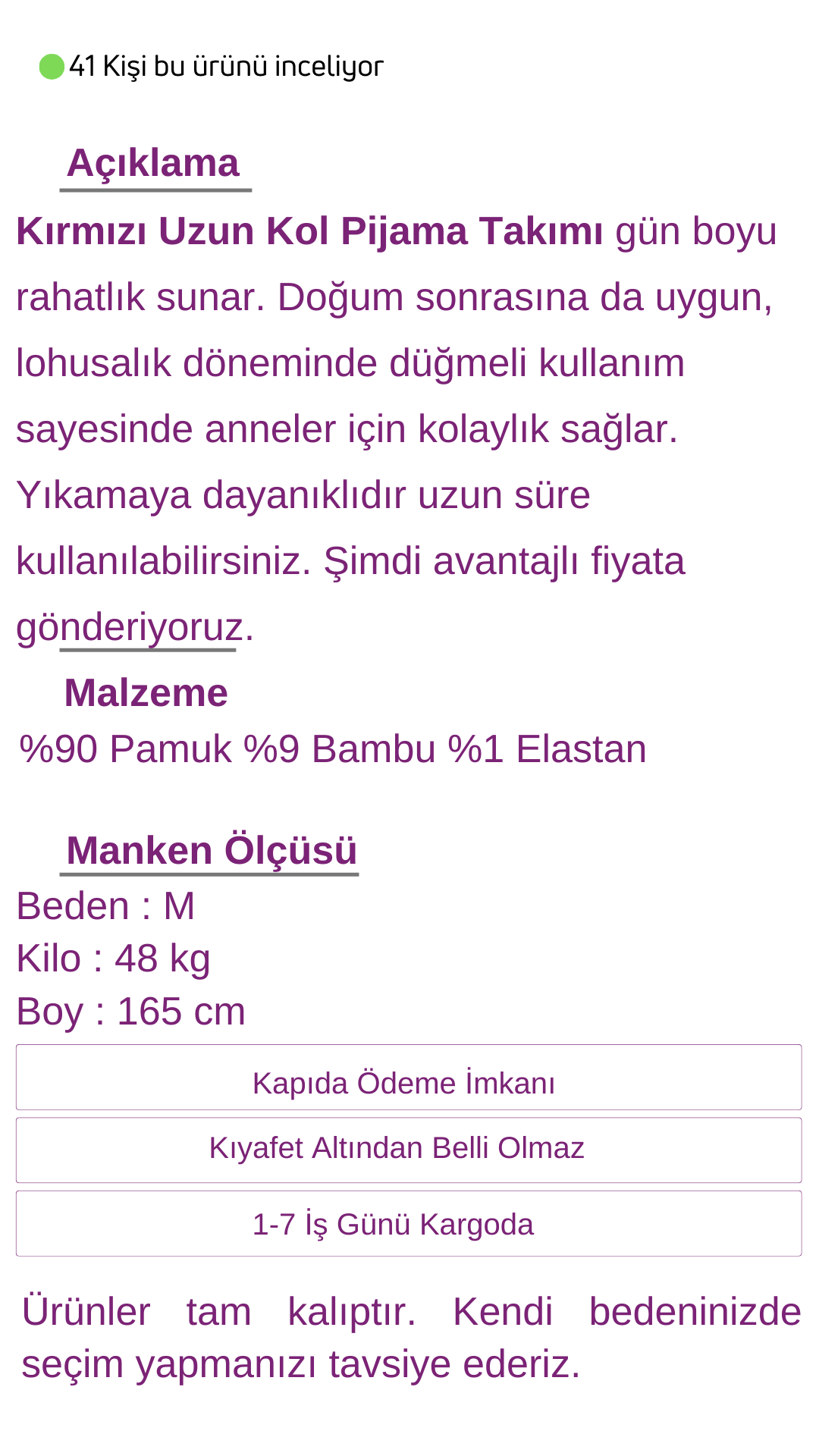 kaliteli ve uygun bir pijama takımı çok şık duruyor doğumda giymek içinaldım 62 kiloyum M beden aldım gayet iyi durdu